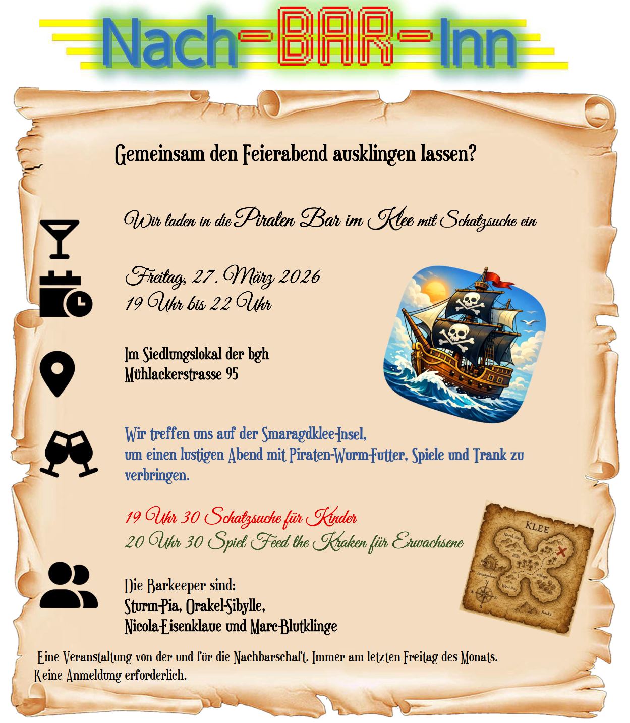 Buche die Bar oder werde Gastgeber:inn. Eine Veranstaltung von der und für die Nachbarschaft. Immer am letzten Freitag im Monat.
